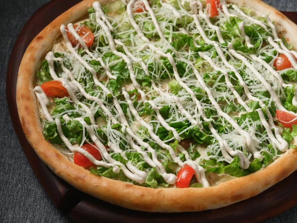 Идеальный микс сочных креветок,сыра пармезан, соуса цезарь на подушке из листьев салата с хрустящими сухариками
